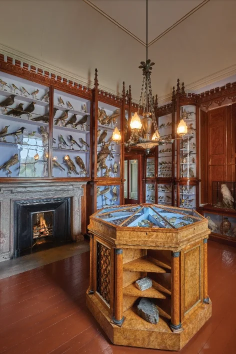 The striking Gothic mahogany cases are from a time prior to Playfair’s alterations, and their presence has preserved a marble fireplace from Floors’ original architect, William Adam. The central display table is in pollard Elm, and dates from the Regency period, containing an eclectic assemblage of geological samples and coinage from the Roman to Victorian periods. The Bird Room divides opinion today, some find it enthralling and others find it odd, but it remains a fantastic example of historical collecting and is a unique survivor from a bygone era.