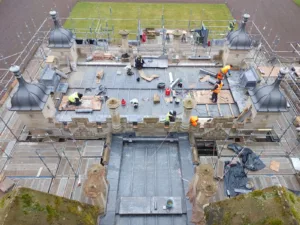 February has seen our first tentative steps into the Castle reroofing and high-level masonry repairs move towards completion of the Porte Cochère (Porch). With joinery work completed to the roof structures of the Porch, the race has been on to make the most of the periods of drier weather to get the new roof coverings down, gutters installed, wall head capping’s in place and the final masonry repairs and pointing completed.