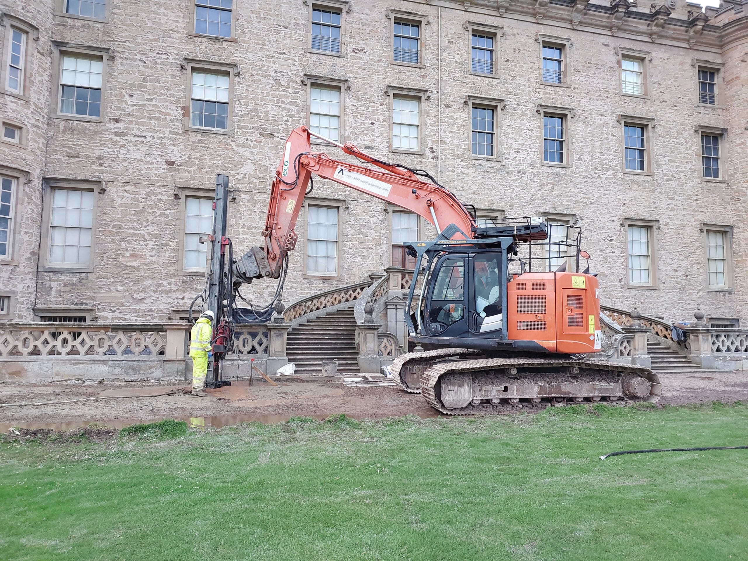 The image above is from late 2025, where the pilings are being driven into the ground to support the scaffolding that was to be built over the months to come. There are almost 150 of these in total, and they are driven down to a depth of six metres into the ground. Cement grout is then poured into the top of the hollow pile, and escapes through apertures in the bottom to fill the shaft and seal the pile in place. The entire project is privately funded, and is anticipated to cost many millions of pounds over 10 years. The scaffolding alone will cost in the region of £3 million.