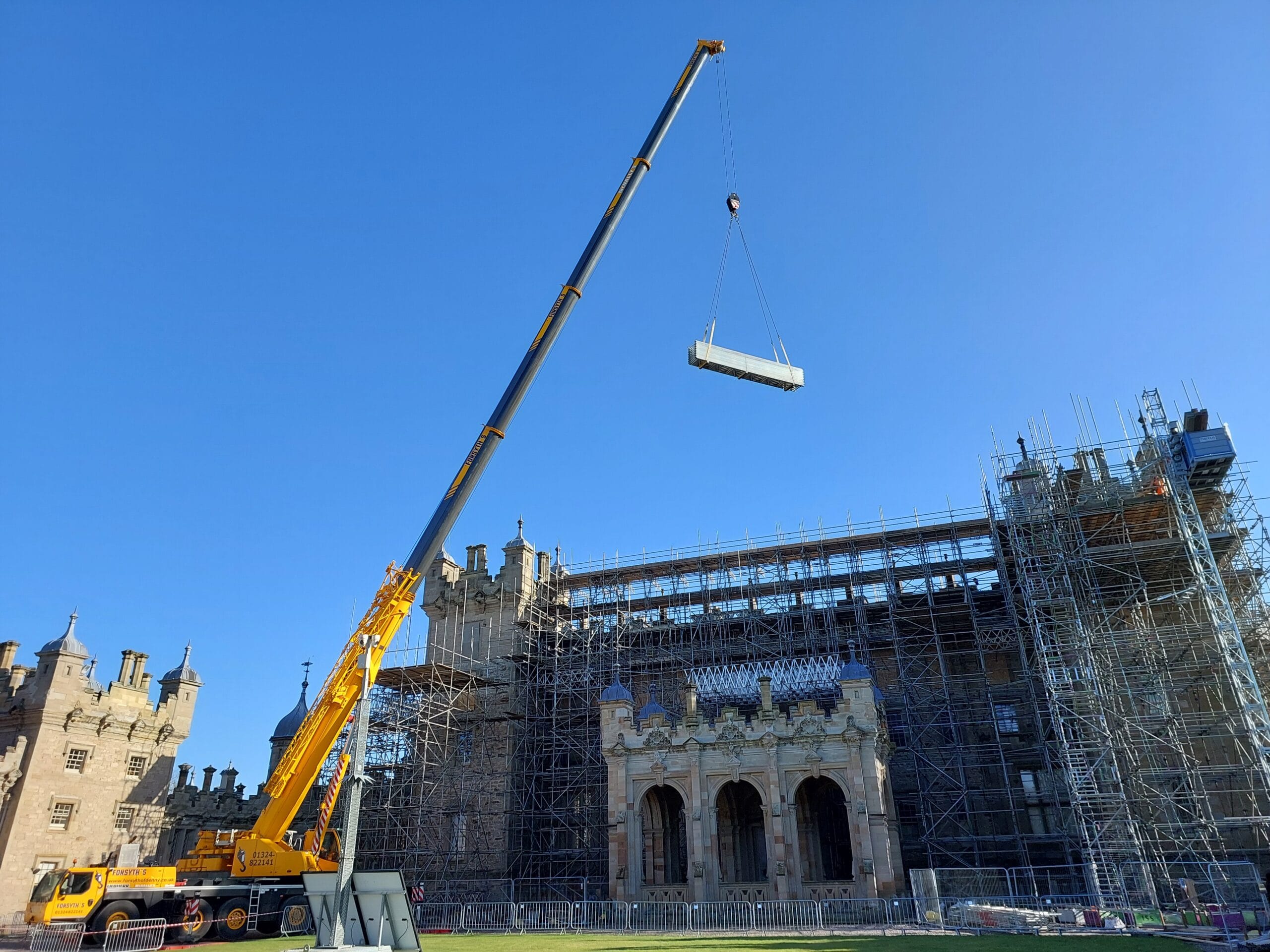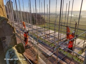 By early January 2026, the scaffold had reached the level of the roof. Some of the conditions that the team were working in were pretty horrendous thanks to the Borders Winter, but there were some good spells too, and the view South from roof level makes it all worth it.