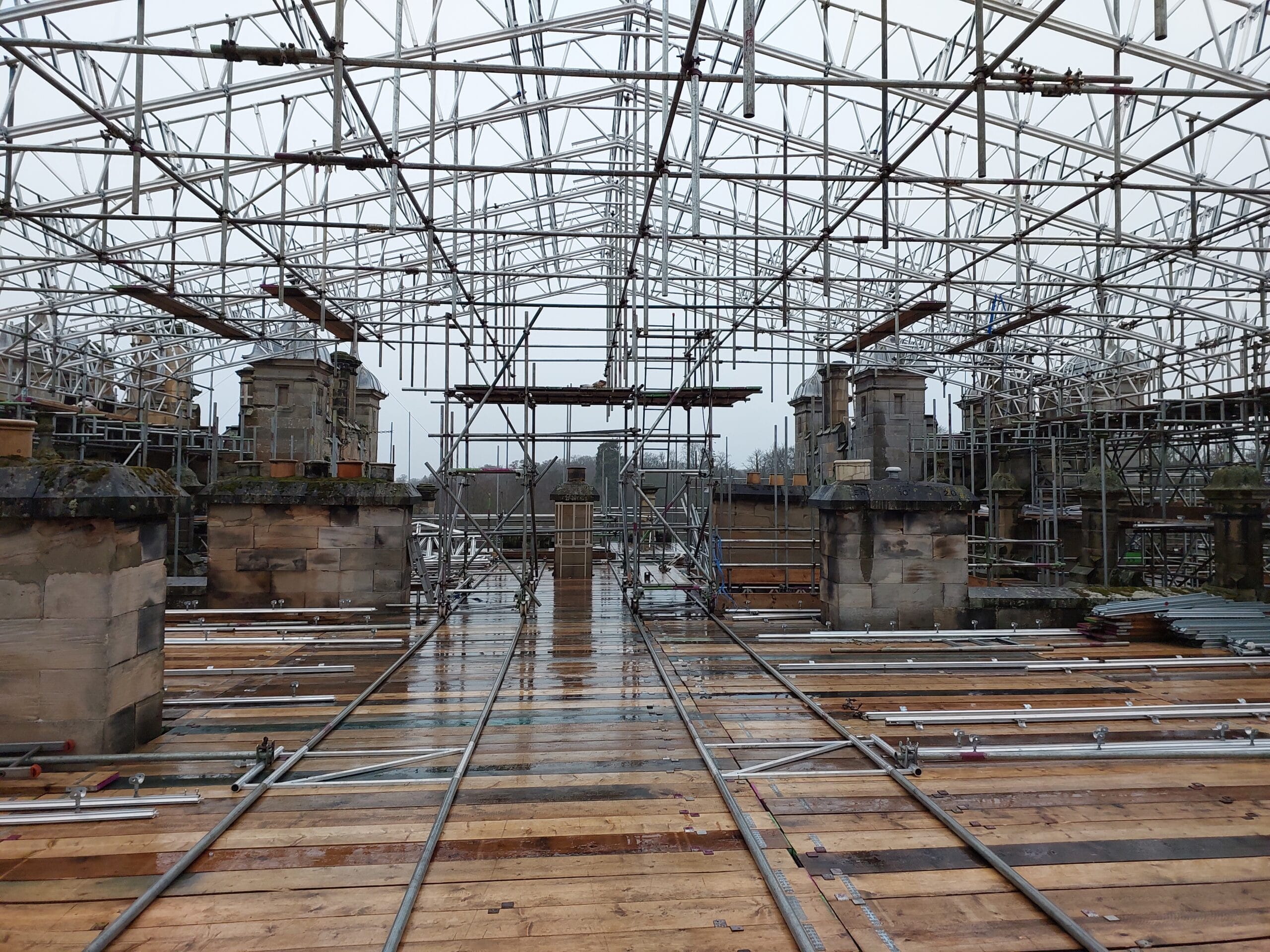 Though it resembles a dancefloor, this temporary surface covering the entirety of the central part of the Castle roof, is in place to allow the team easy movement across the site, and to allow them to install the canopy over the top of the works to protect them and the site from the weather. The towers visible in the background of this image will be addressed first, followed by the chimney visible at the centre of the image. The canopy will then be installed and the flooring removed to allow work to continue on the main roof.