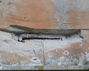 The image to the left shows one of the problems across the high-level stonework on the northern face of the Castle. You can clearly see the effect that time and weather have had on the stone. The sandstone has eroded around the iron cramp connecting two stones. The protective lead coating that encapsulated the cramp is also severely compromised. Where these cramps are found, they will be replaced with stainless steel versions and re-leaded using the original technique used in the 1830s.