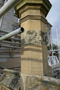 These images show the variety of different issues faced by the team in terms of the stonework they will encounter during this phase of the project. It comes from almost 150 years of reactive repairs and conservation work. These two identical features have fared quite differently over the years. The left hand image shows the face of the sandstone blocks spalling away from the main structure. This happens due to a process of soaking and drying, over time crystallising salts within the sandstone, which then expand and separate the sturcture in layers.